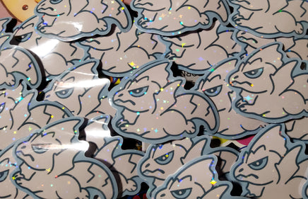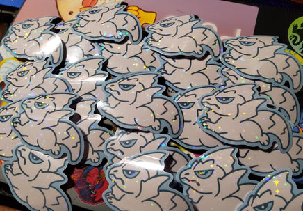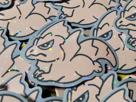 Even all grown up he's still adorable, just a lot grumpier! A 3 inch, glossy sticker with a star holo finish. It can adhere to most any clean surface and is waterproof so it is great for things like water bottles, but don't put it on a car, the sun will bleach it.