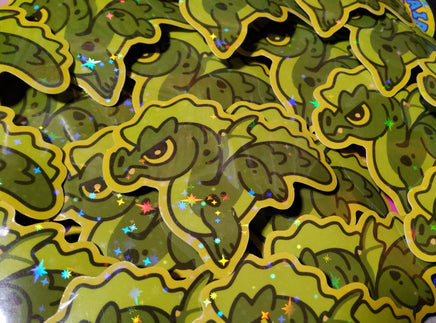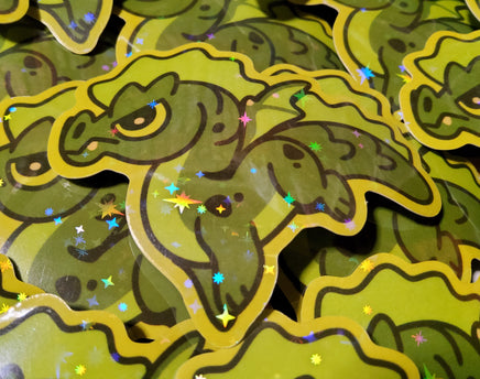 Even all grown up she's still adorable, just a lot grumpier! A 3 inch, glossy sticker with a star holo finish. It can adhere to most any clean surface and is waterproof so it is great for things like water bottles, but don't put it on a car, the sun will bleach it.