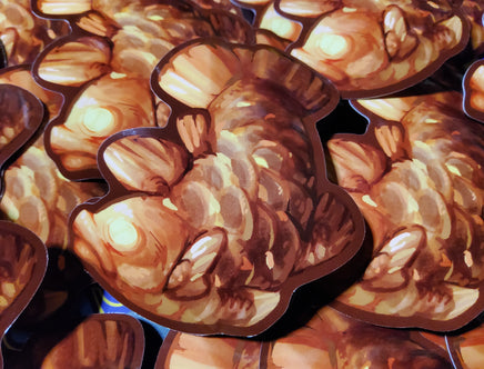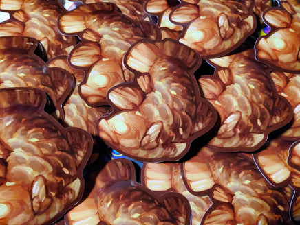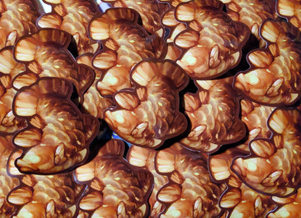 Taiyaki with weird fish is fun! This 3 inch sticker has a glossy finish and can adhere to most any clean surface and is waterproof so it is great for things like water bottles, but don't put it on a car, the sun will bleach it.