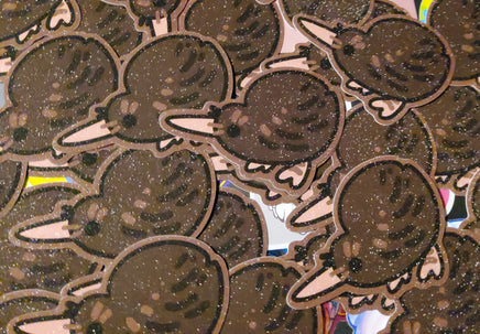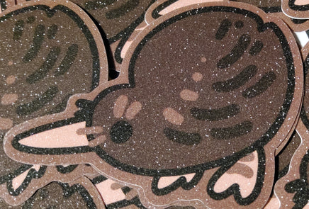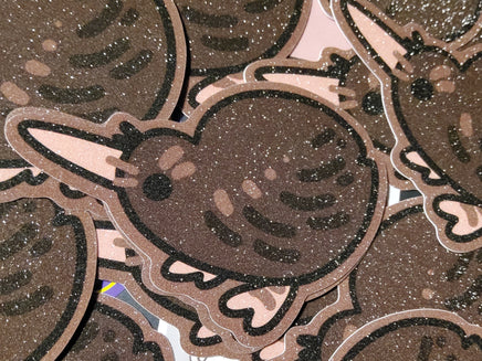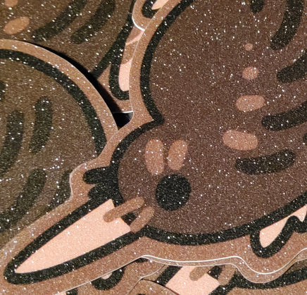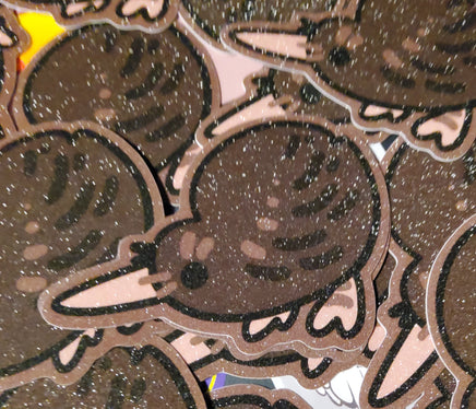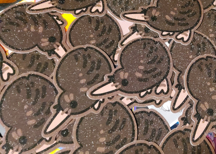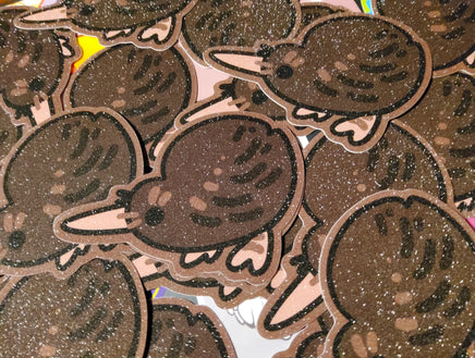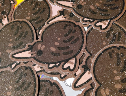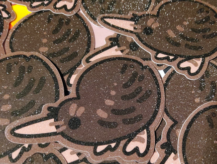 The second best ratite who is just as silly and floppy as the emu. A 3 inch, glittery sticker with a pleasant texture and shimmer. It can adhere to most any clean surface and is waterproof so it is great for things like water bottles, but don't put it on a car, the sun will bleach it.