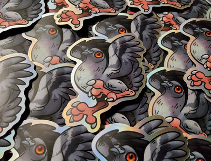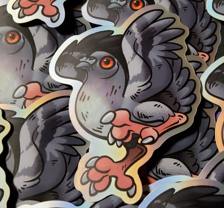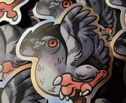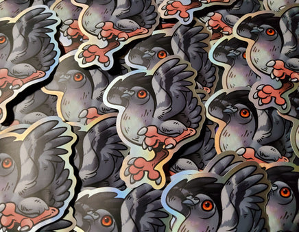 This matte mirror sticker has a subtle holographic shine around the edges which help to make the subject pop! A handsome pigeon as a 3 inch sticker. Waterproof and adheres to most any clean surface, but not for permanent outdoor use.