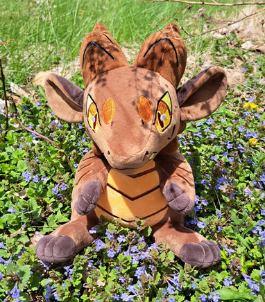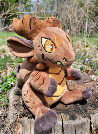 This cuddly kobo friend is made in short minky and carefully detailed with embroidery. With wavy horns, a friendly but mischievous expression, floppy ears, and a prominent tail, this creature and their adorable lil paws are based more on the cute kobold ideal than the fierce one.