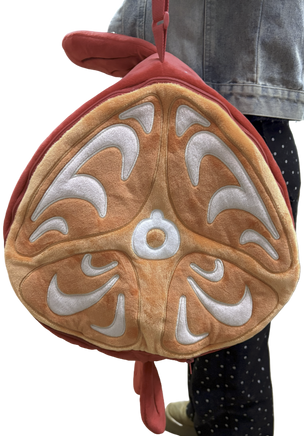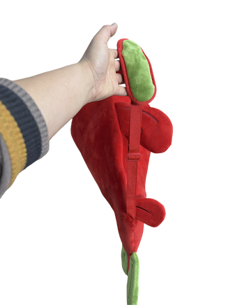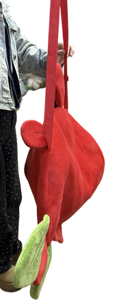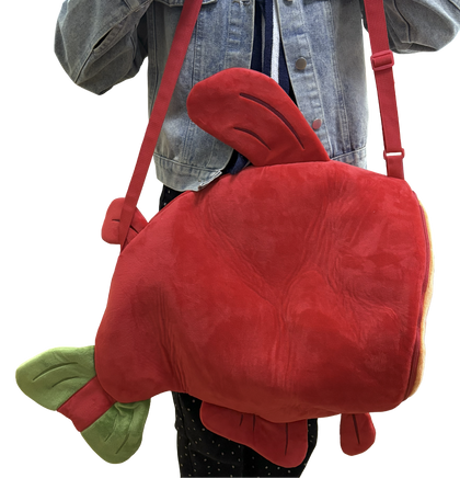 This fish meat bag is mostly space on the inside, with a 16 inch deep pocket and a large opening front! It can be folded flat or filled to the brim, and fits most daily carry accessories like tablets, switches, books, and phones. It has no separated compartments and minimal stuffing, allowing for as much space as possible. The strap has an adjustable length and a small shoulder pad. This bag still looks great even compared to users in large cosplay or fursuits, and it doubles as a prop to do fun character acting with!