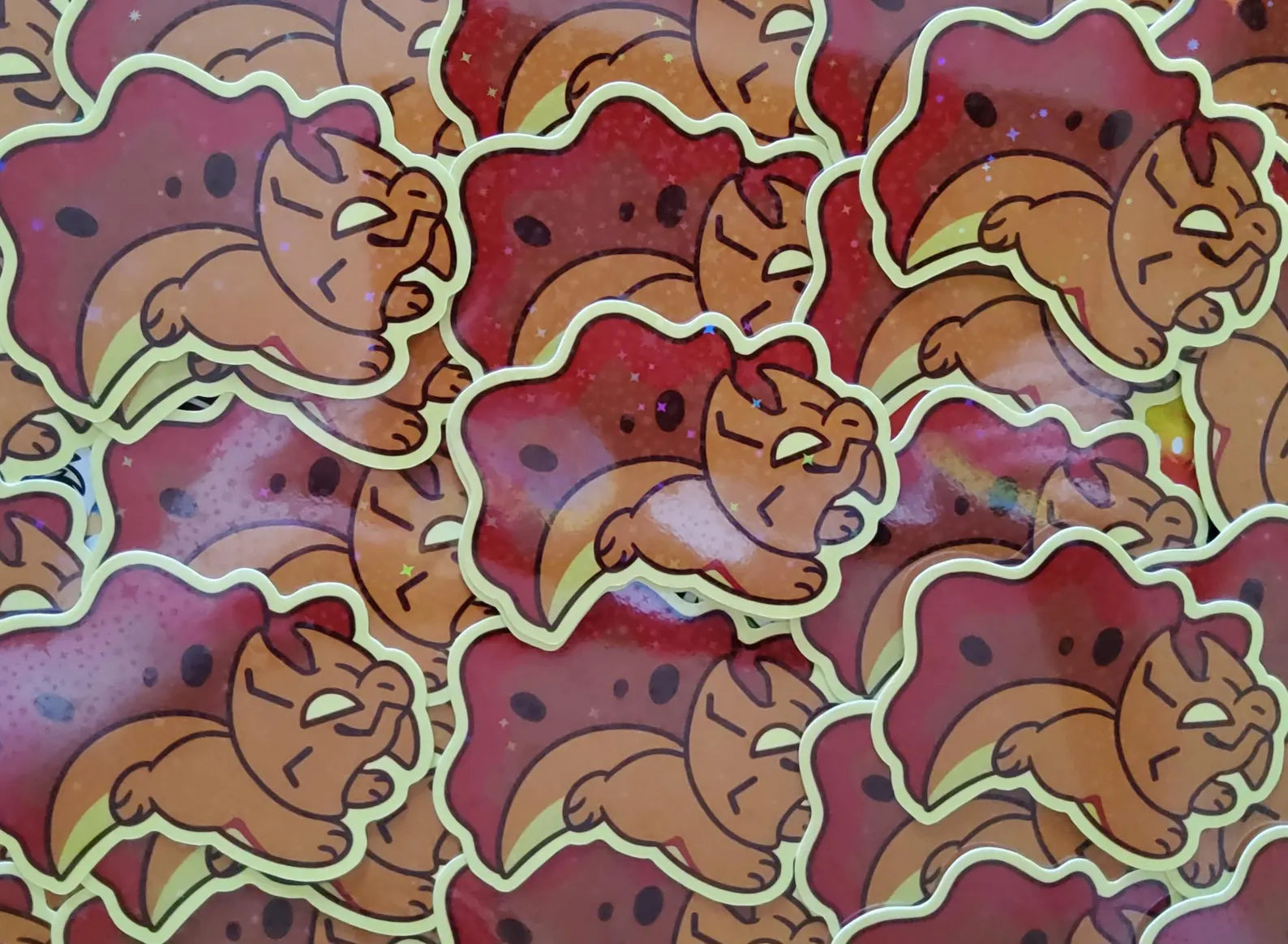 A 3 inch, glossy sticker with a star holo finish. It can adhere to most any clean surface and is waterproof so it is great for things like water bottles, but don't put it on a car, the sun will bleach it.