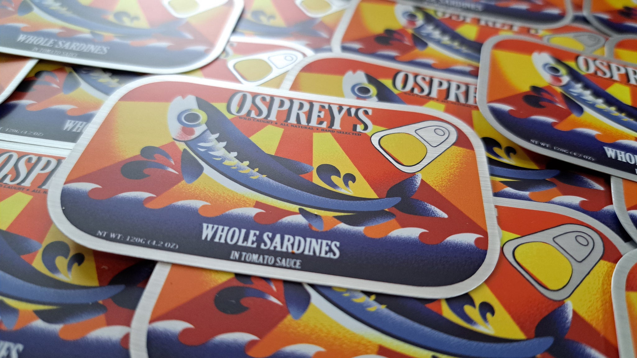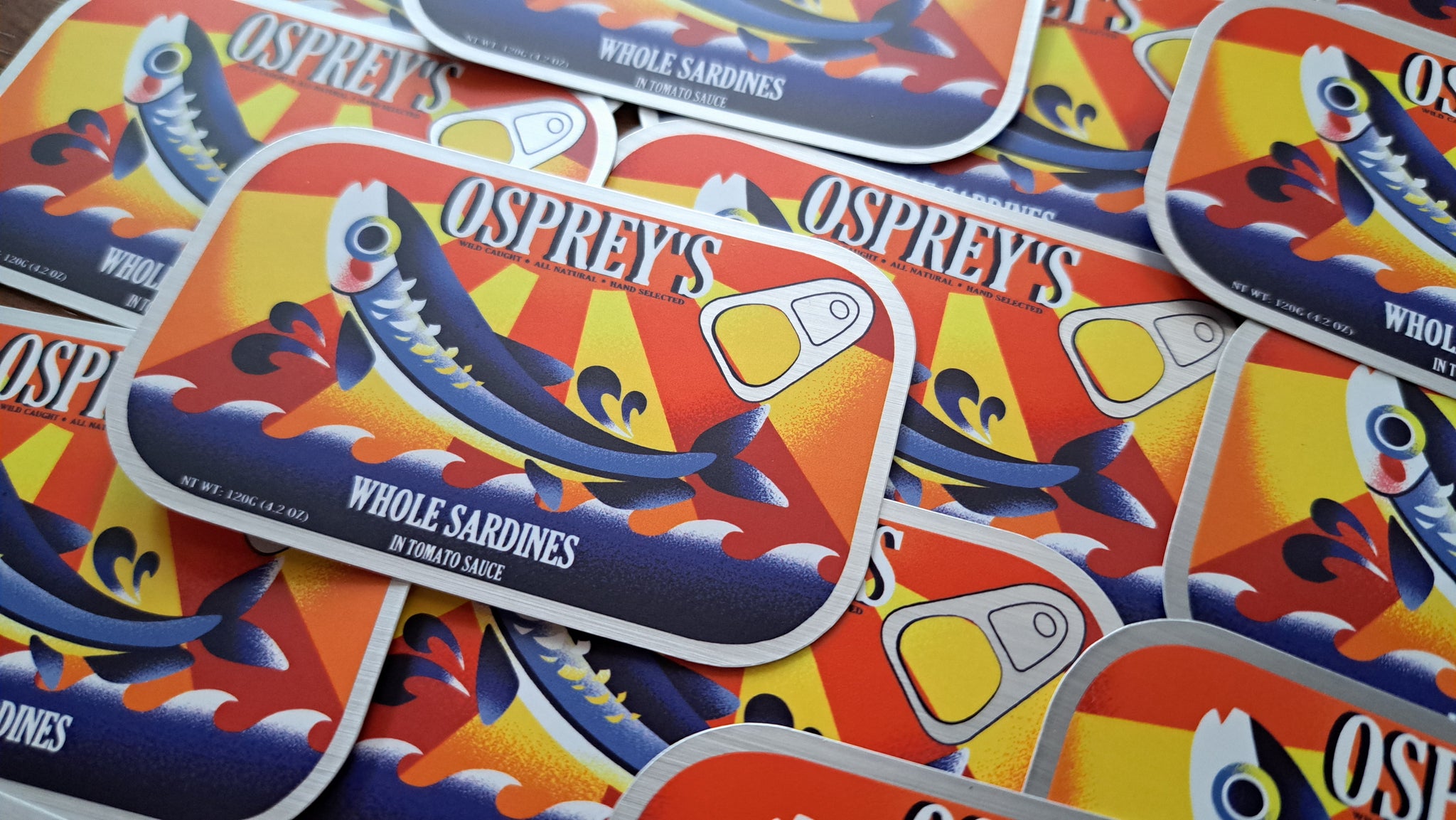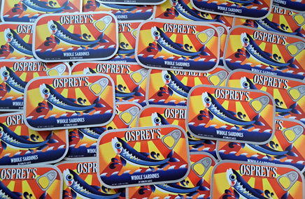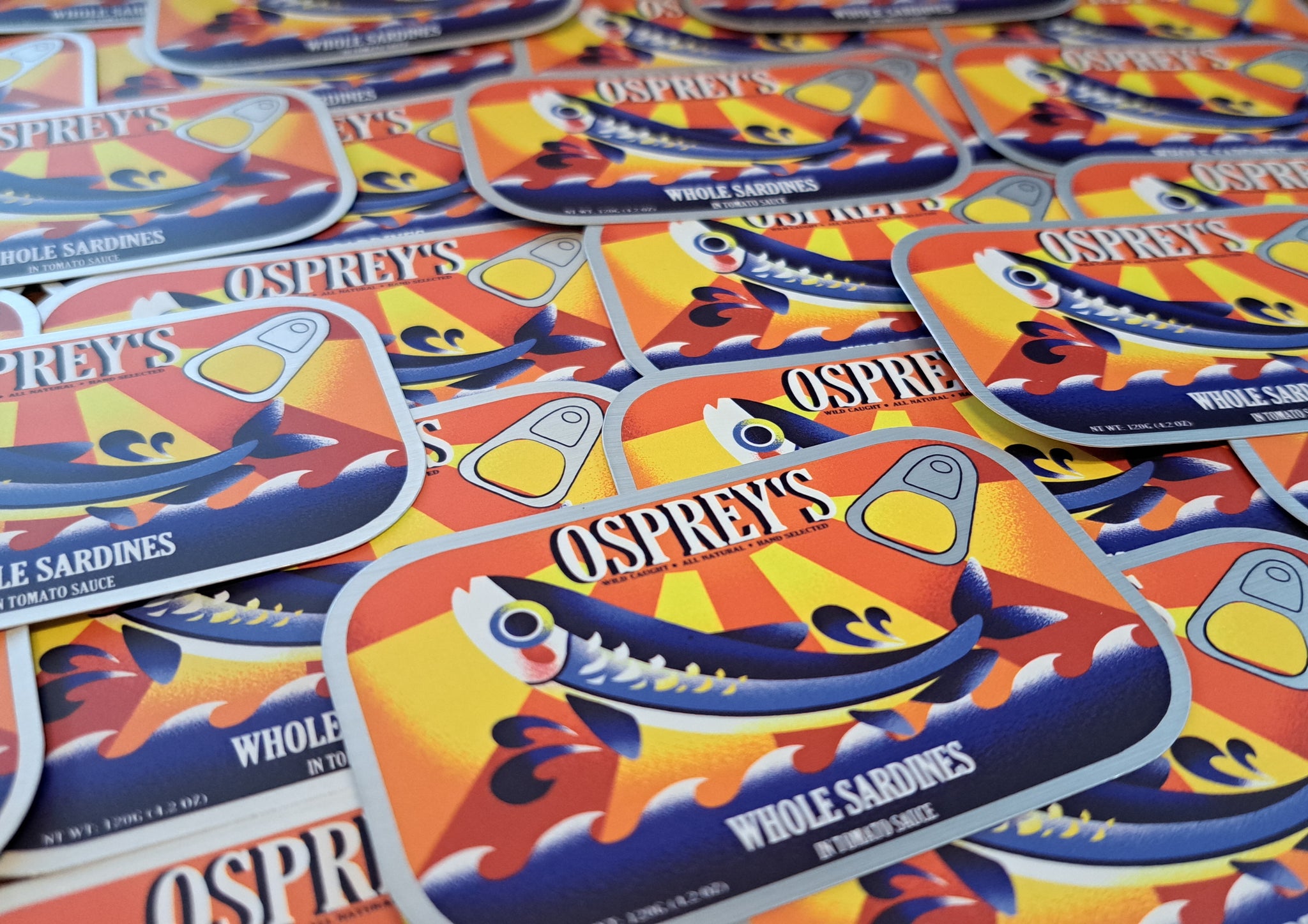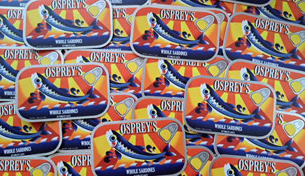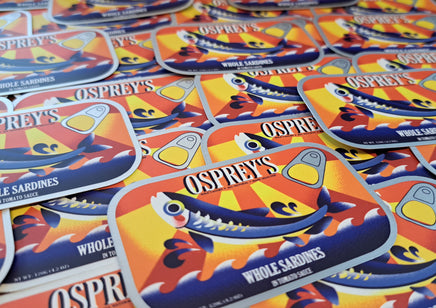A 3 inch, semi-gloss sticker with a slightly matte mirror finish to the metal parts. Based on a combination of many sardine can designs. It can adhere to most any clean surface and is waterproof so it is great for things like water bottles, but don't put it on a car, the sun will bleach it.
