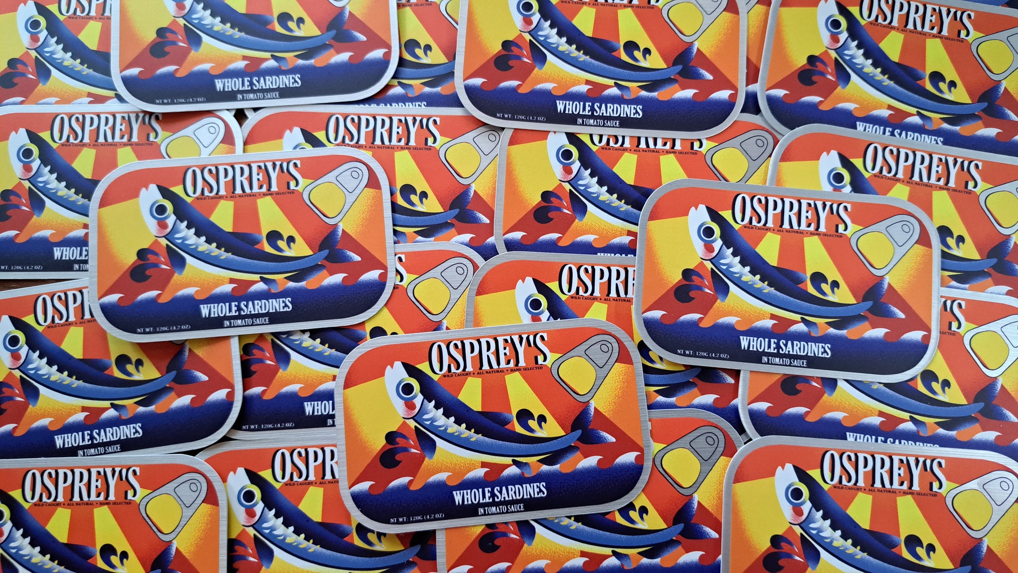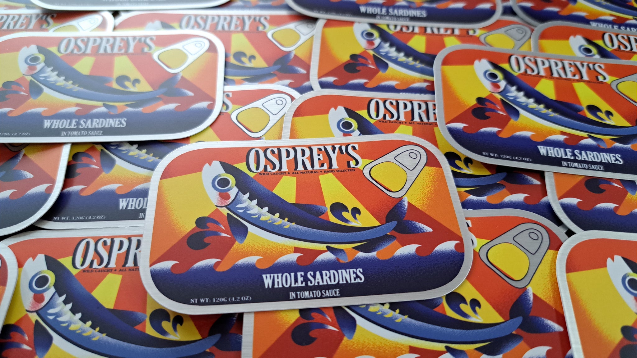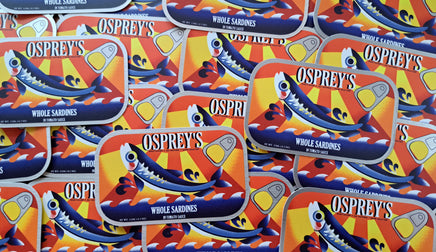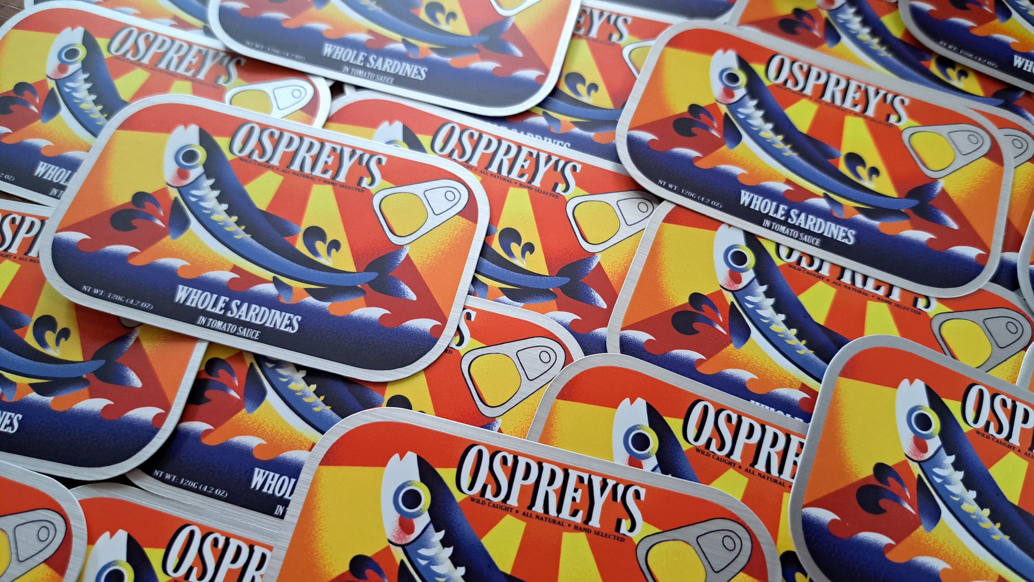 A 3 inch, semi-gloss sticker with a slightly matte mirror finish to the metal parts. Based on a combination of many sardine can designs. It can adhere to most any clean surface and is waterproof so it is great for things like water bottles, but don't put it on a car, the sun will bleach it.